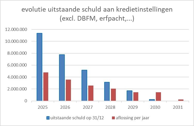 Onderstaande tabel toont de evolutie van de uitstaande schuld aan kredietinstellingen volgens eindjaar (excl. nieuw op te nemen leningen):